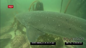 Select options DownloadFemale diver swimming with Sevengill sharks in U/W forest , general shot
