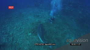 Select options DownloadTiger Shark swimming underwater in ocean passing by camera and diver talking pictures of it MWS TRA HAND