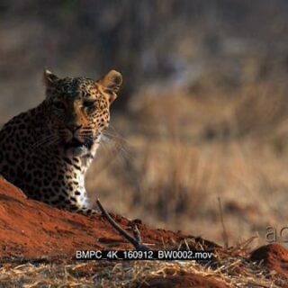 Leopard sitting next to an ant hill facing towards camera