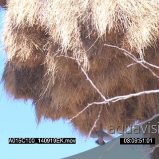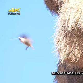 Sociable weavers flying in and out of nest carrying dry grass in beaks building nest SLOWMO