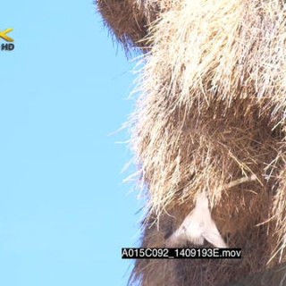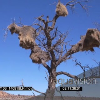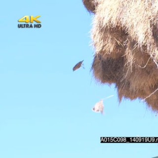 Sociable Weavers flying in and out of nest building carrying grass with beaks SLOWMO