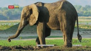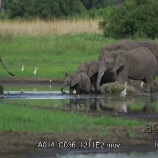 Elephant herd including juveniles at waterhole spraying themselves with mud, Male adult elephant walks off its genitals dangling