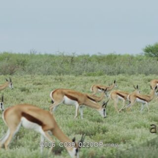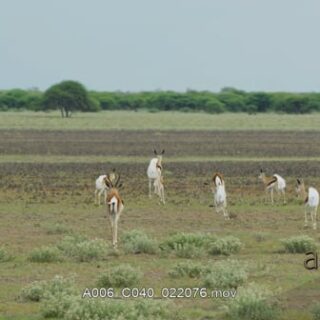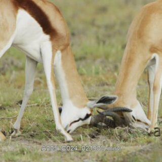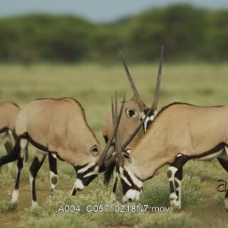 Two Gemsbok sparring while kneeling down, walking and herd of Springbok grazing on grass.
