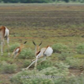 WS of a cheetah eating off springbok carcass then chases jackals away. Note jackal bite cheetah’s tail.
