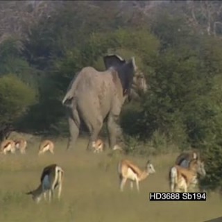 African elephant covered in mud walking running away into bushes past Zebras Springboks grazing