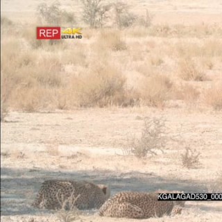 Cheetah pair laying down on stomachs looking across stalking hunting Springbok grazing in the distance 2SHOT BURNED OUT