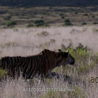 Select options DownloadTiger hunting, looking around and stalking prey, dry grass.