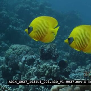 A Tracking, Close Up shot of a pair of endemic Red Sea Bannerfish, Heniochus intermedius swimming together.