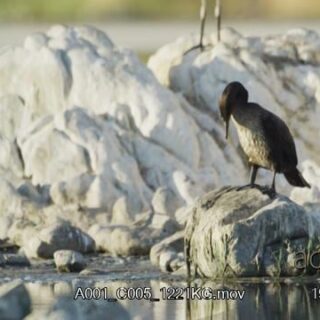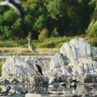 Grey heron and White-breasted cormorants landing on rocks, standing and looking around.