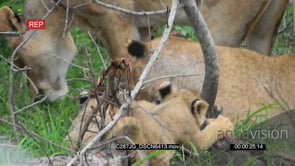 A Pride of African Lions with Cubs feeding on the Antelope Kill, Male Leopard Sitting on top of the Tree Looking Down on them GENERAL BEHAVIOR