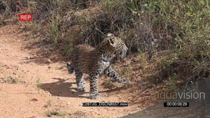 Leopard walking passing by the Game Ranger Vehicle followed by the Cub GENERAL BEHAVIOR