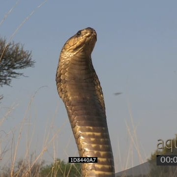 Aggressive snouted cobra strikes front of camera