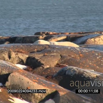 Polar bear walking amongst boulders ocean in BG