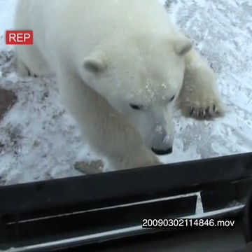 Tourist looking out window at Polar bear investigating tour bus