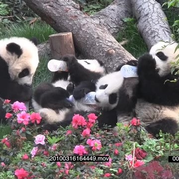 A group of Giant Panda cubs feeding from bottles WS GENERAL BEHAVIOUR