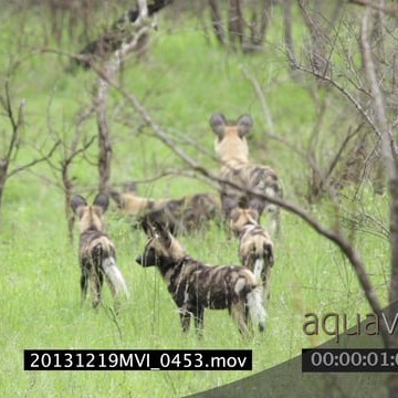 African Wild dog pack scouting patrolling around hunting GREEN LS PAN