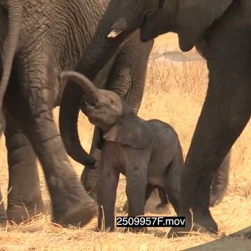 African elephant baby struggling to stand attempting to suckle from mother surrounded by herd