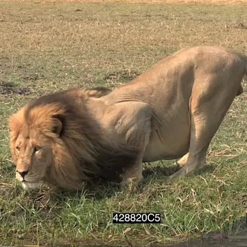 Male African lion drinking at waterhole edge