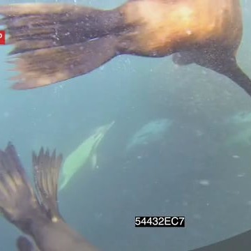 Cape Fur seals near camera Common Dolphins feeding off Sardine baitball underwater HANDHELD