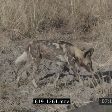 African wild dogs patrolling around through dry grass hunting SEMI DRY