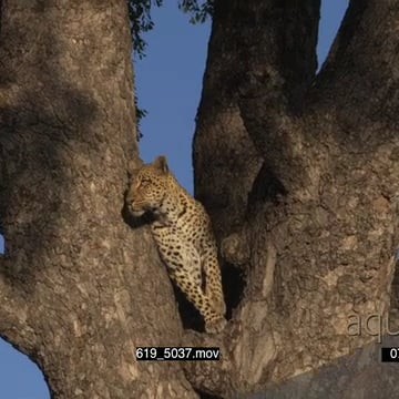 Leopard standing next to a tree looking around and climbing up the tree GOOD LIGHT MLS TU MS