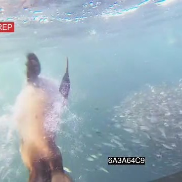 Common Dolphins Cape Fur Seals hunting feeding on Sardine bait ball UNDERWATER HANDHELD