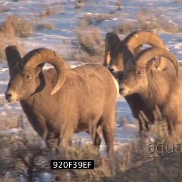 Bighorn Sheep standing on snowy prairie looking at camera then walking around MLS PAN
