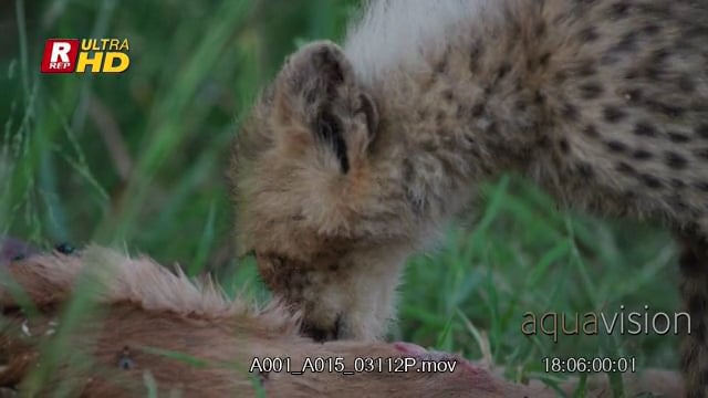 Cheetah Cub laying down, walking to the carcass and feeds on the remaining.