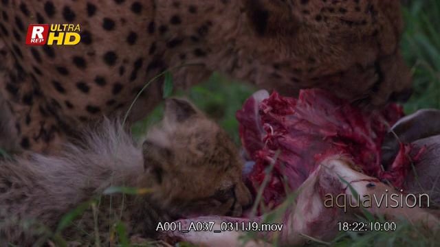 Female Cheetah and her Cub feeding on the dead carcass while laying down.
