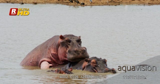 Two Hippos wading, mating and looking around.