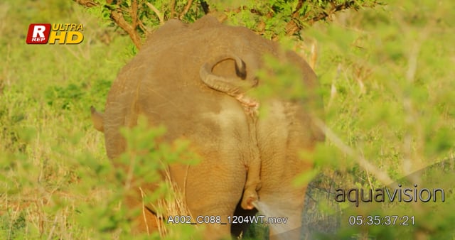 White rhinoceros back view, standing, feeding on grass and urinating.