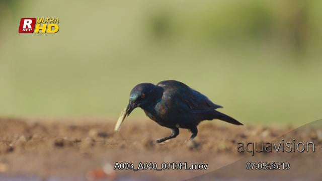 Cape glossy starling standing, forcibly removing the insect stings looking around and feeding on a ground insect.