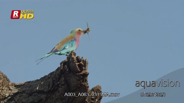 Lilac-breasted roller on a perch, holding its prey with its beak and flying off.
