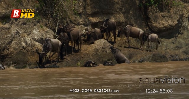 Herd of young and adult Blue Wildebeest crossing the river, wading and swimming.