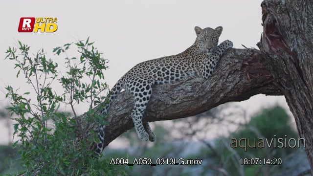 Leopard laying on a tree branch, looking towards the camera and resting.