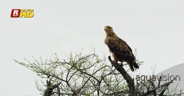 Tawny Eagle hunting from a high angle, looking around around and towards the camera. WS.