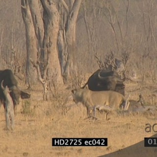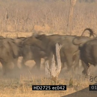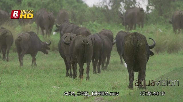 Herd of Cape Buffalo back view, walking, defecating, urinating and feeding on grass.