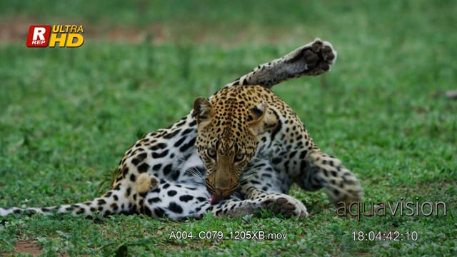Leopard laying down, one leg on the head, grooming while looking towards the camera.