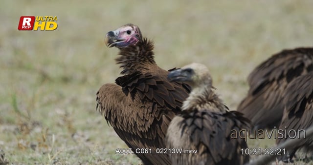 Two Lappet-faced Vultures standing, looking around and walking out of frame.