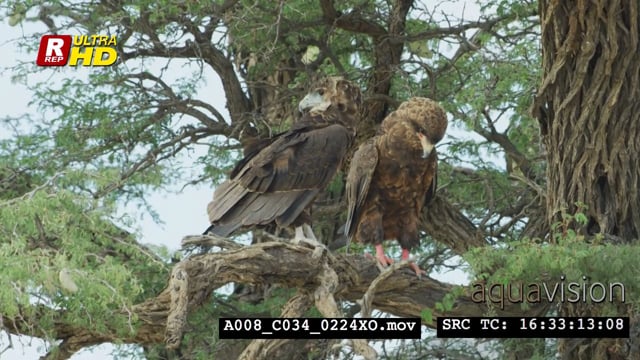 Two Bateleur eagles sitting on a tree branch and looking around.