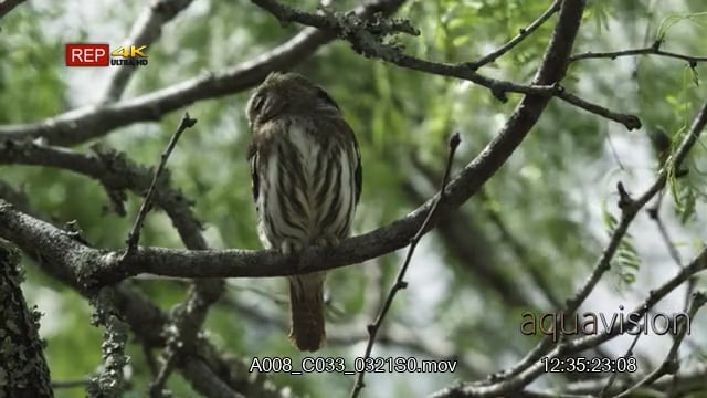 LA of a Ferruginous pygmy owl perched on tree, back view, looking around and hunting for preys.