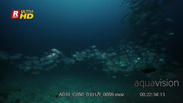 Wide slow motion shot of a huge school of bigeye trevally, bigeye jacks swirling in a long chain formation.