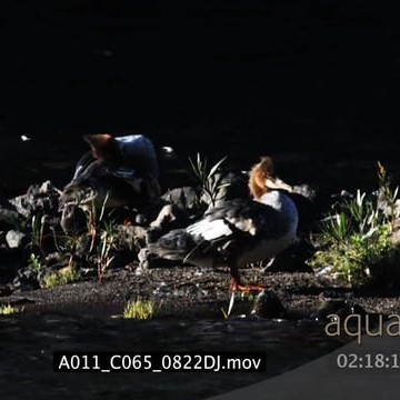 Red-breasted Mergansers standing on riverbank preening MLS