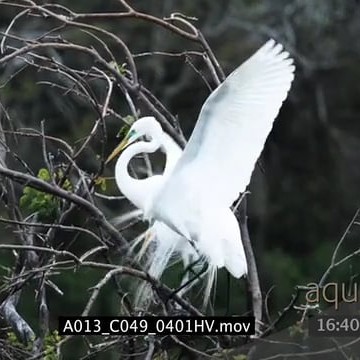 Great Egret standing on tree and one landing with feathers blowing in the wind MWS