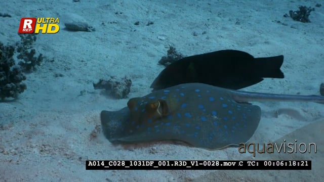 A Close Up of a Bluespotted Ribbontail Ray, Taeniura lymna hunting in sea sand , while Wrasse Fish waits for scraps.