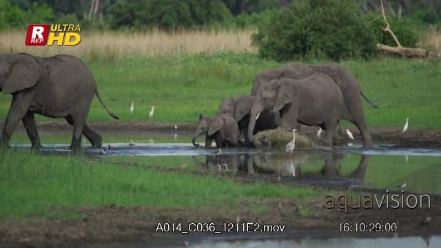 African Elephant herd standing and drinking water from a waterhole WS PROFILE