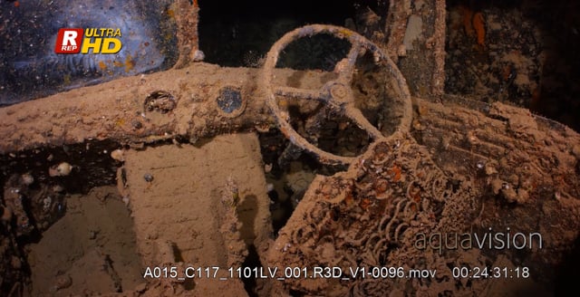 Close Up of the last remaining truck steering wheel in the cab of a truck, on the Thistlegorm shipwreck.