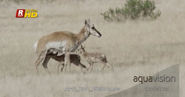 Adult Pronghorn walking with her two calves running around, playing and feeding/suckling, during midday. MWS, PAN.