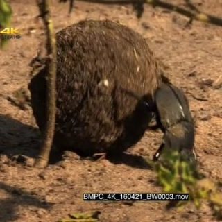 Dung Beetle rolling the dung ball with its hind legs outdoor during daytime.