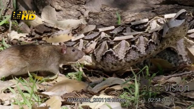 Gaboon viper laying, a mouse walks around, aims to strike and defend itself.